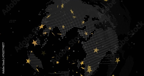 © vectorfusionart, Naklejka premium Displaying dotted globe silhouette floating on dark grid, featuring gold stars and code fragments