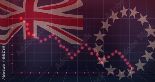 © vectorfusionart, Obraz premium Displaying dotted red downward-trending line graph on 3D grid floor, with Union Jack and EU stars