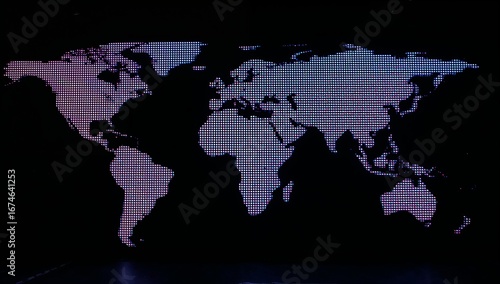 Fototapeta premium Displaying dotted world map on LED display screen at dark stage, with gradient lights