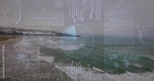 © vectorfusionart, Naklejka premium Displaying drone aerial coastline with sandy beach and rocky cliffs left, showing HUD radar