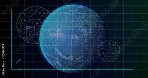 © vectorfusionart, Obraz premium Displaying Earth-like globe rotating within virtual HUD, with Cartesian axes and wireframe spheres