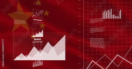 © vectorfusionart, Naklejka premium Displaying financial charts over red flag backdrop with large area chart, bar and line graphs, star