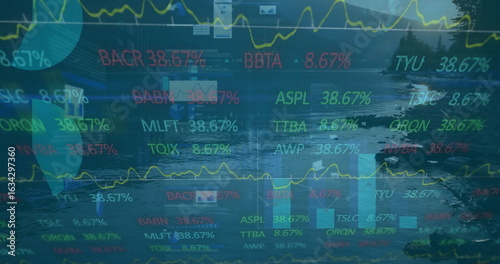 © vectorfusionart, Fototapeta premium Displaying financial data overlay on mountain lake shore, with ticker symbols, line and bar charts