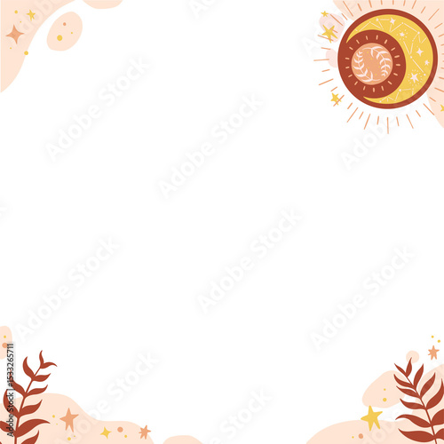 Naklejka premium Displaying flat border featuring stylized sun rings, sparkles, branches,...