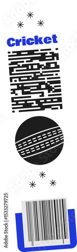 Fototapeta premium Displaying flat cricket-themed label on transparent canvas with stars, bars, barcode, cricket ball