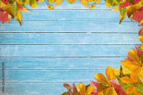 Fototapeta premium Displaying flat textured blue wooden planks framing overlapping autumn leaves in fall colors