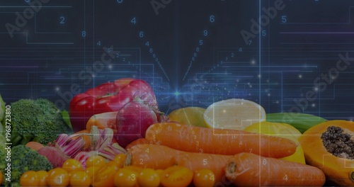 © vectorfusionart, Obraz premium Displaying fresh produce on dark reflective surface at studio, showing carrots, papaya, HUD overlay