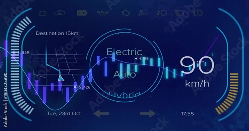 Fototapeta premium Displaying futuristic HUD in vehicle cockpit, showing 90 km or h speedometer and mode selector