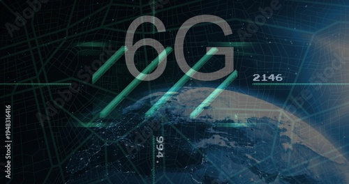 Naklejka premium Displaying 6G label and teal beams crossing partial Earth globe on futuristic...