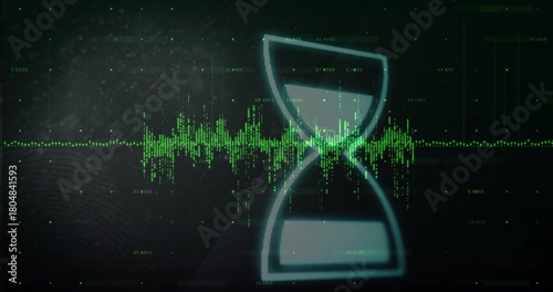 Obraz premium Displaying glowing hourglass outline overlaying neon-green waveform on HUD,...
