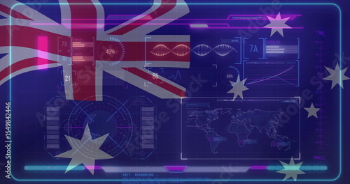 © vectorfusionart, Fototapeta premium Displaying holographic interface on dark blue grid, with Australian flag pie chart and waveform