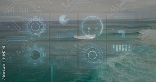 Obraz premium Displaying holographic interface panels floating above open sea, with data charts and circuits