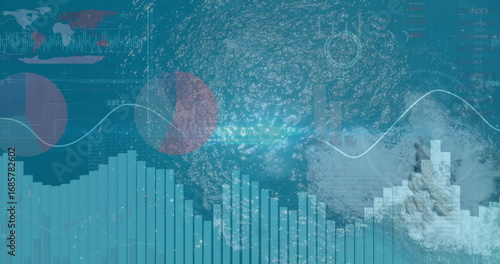© vectorfusionart, Fototapeta premium Displaying jetty with breaking waves being overlaid by data visualizations at sea, copy space