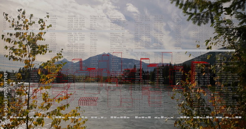 © vectorfusionart, Fototapeta premium Displaying lake view reflecting mountains at lakeshore, with data overlay, red blocks and branches