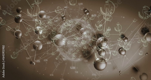 Obraz premium Displaying metallic spheres forming network in digital space, with human icons and numeric labels