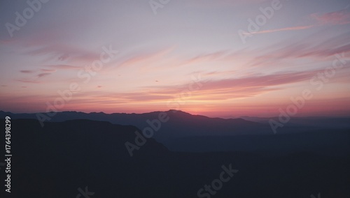 Fototapeta premium Displaying mountain ridges silhouetting under colorful dawn sky, with wispy clouds adding texture