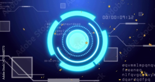 © vectorfusionart, Fototapeta premium Displaying neon-blue HUD ring rotating on blue backdrop, showing stars, timer, UI outlines, code