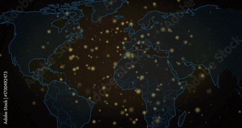 Fototapeta premium Displaying neon blue outlined world map showing glowing data nodes on...