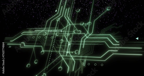 Fototapeta premium Displaying neon green glowing circuit network floating in space, with dashed lines, nodes, arrows