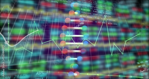 © vectorfusionart, Obraz premium Displaying neon-green line graph moving across stock market dashboard, with colored circular nodes