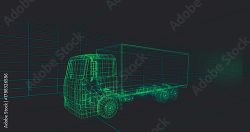 Fototapeta premium Displaying neon-green wireframe box truck showing chassis and wheels in CAD...