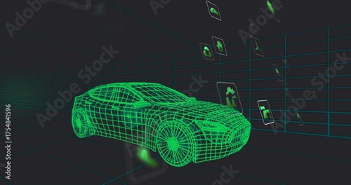 © vectorfusionart, Obraz premium Displaying neon green wireframe sports car in virtual 3D space, with grid planes and floating icons