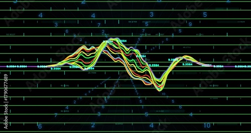 Naklejka premium Displaying neon waveform bundle oscillating across virtual dashboard, showing green grid, markers