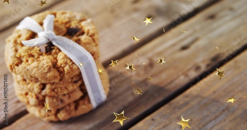 Fototapeta premium Displaying oatmeal cookie stack tied with pale ribbon on worn wooden plank, gold stars, copy space