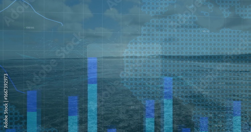 © vectorfusionart, Obraz premium Displaying ocean stretching toward horizon in open sea, with translucent bar charts and line graphs