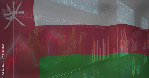 Naklejka premium Displaying Oman flag overlaying dashboard, scrolling tickers, bar charts,...