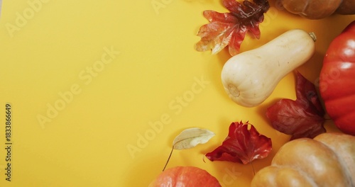 Naklejka premium Displaying orange pumpkins, butternut squash and dried maple leaves on yellow...