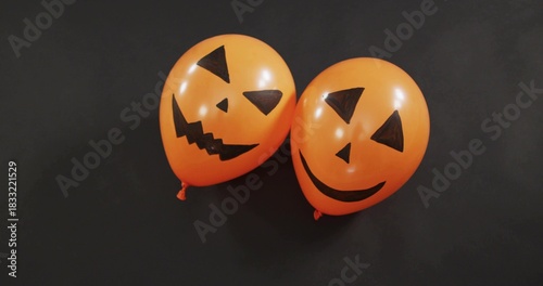 Fototapeta premium Displaying paired orange jack-o'-lantern balloons glowing under studio light,...