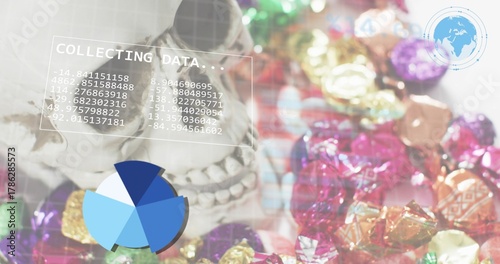 © vectorfusionart, Fototapeta premium Displaying pale skull left-side in studio, showing data overlays and metallic wrappers, copy space