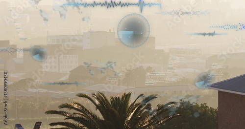 © vectorfusionart, Obraz premium Displaying palm tree and chairs on terrace overlooking hazy cityscape, with digital HUD overlays