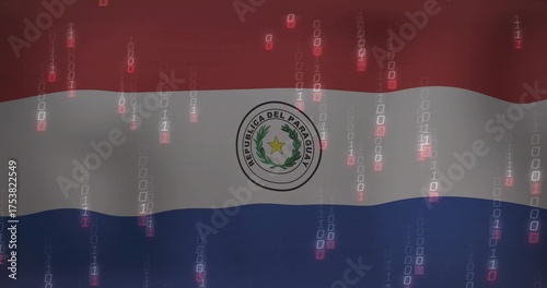 Naklejka premium Displaying Paraguayan flag with coat of arms emblem across digital graphic, streaming binary code