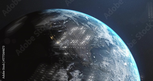Fototapeta premium Displaying planet Earth revealing sunlight and shadow in space, with numeric overlays, city lights