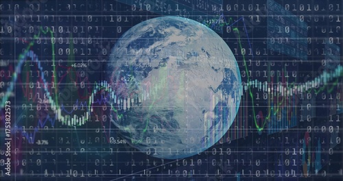 Fototapeta premium Displaying planet Earth rotating in virtual analytics hub, with binary code and financial charts