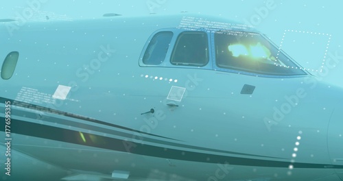 Fototapeta premium Displaying private jet nose reflecting sunlight at airfield, with cockpit windows, digital overlay
