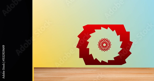 © vectorfusionart, Obraz premium Displaying red jagged-ring artwork with mandala on gradient wall, with wood floor, black panel