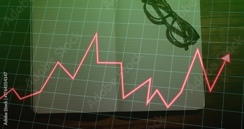 Naklejka premium Displaying red line graph arrow rising over grid overlay on office desk, with laptop eyeglasses