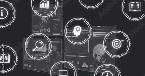 Obraz premium Displaying semi-transparent dashboard panels with charts, HUD rings and icons...