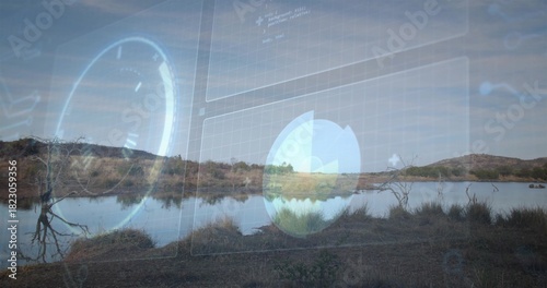 © vectorfusionart, Fototapeta premium Displaying shallow pond and grassy banks reflecting dead tree at remote marsh, with HUD overlay