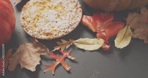 © vectorfusionart, Naklejka premium Displaying small crumbed tart sitting on gray table at home, with dried autumn leaves and pumpkins