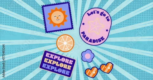 Fototapeta premium Displaying stickers on turquoise burst with sun sticker, PARADISE badge,...