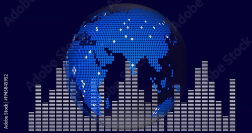 Fototapeta premium Displaying stylized blue globe pulsing with data nodes in graphic studio, with white equalizer bars
