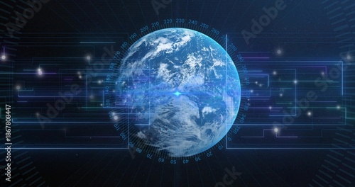 © vectorfusionart, Obraz premium Displaying stylized Earth globe rotating in space virtual interface, with holographic compass