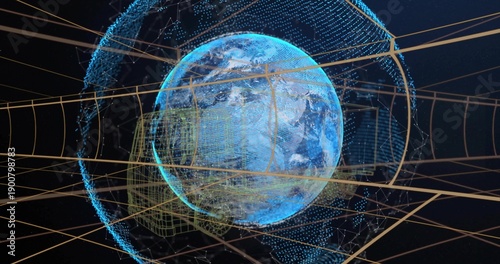 Naklejka premium Displaying stylized Earth globe rotating in space, with blue point cloud...