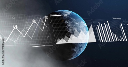 Naklejka premium Displaying stylized Earth graphic floating in space, with gridded panels and line-area-bar charts
