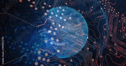 Naklejka premium Displaying stylized Earth-like globe glowing with circuitry in cyber environment, with data nodes