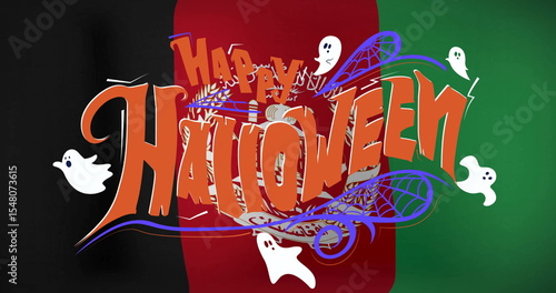 Fototapeta premium Displaying stylized Happy Halloween text on art canvas with white cartoon ghosts and web swirls